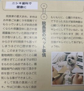 11月にご来院の患者様に順次お渡ししています。今回はマルチーズのまめの事を載せています。元気一杯食欲旺盛なまめですが引き取った時には沢山病気がありました。2回の手術を乗り越え頑張っています。